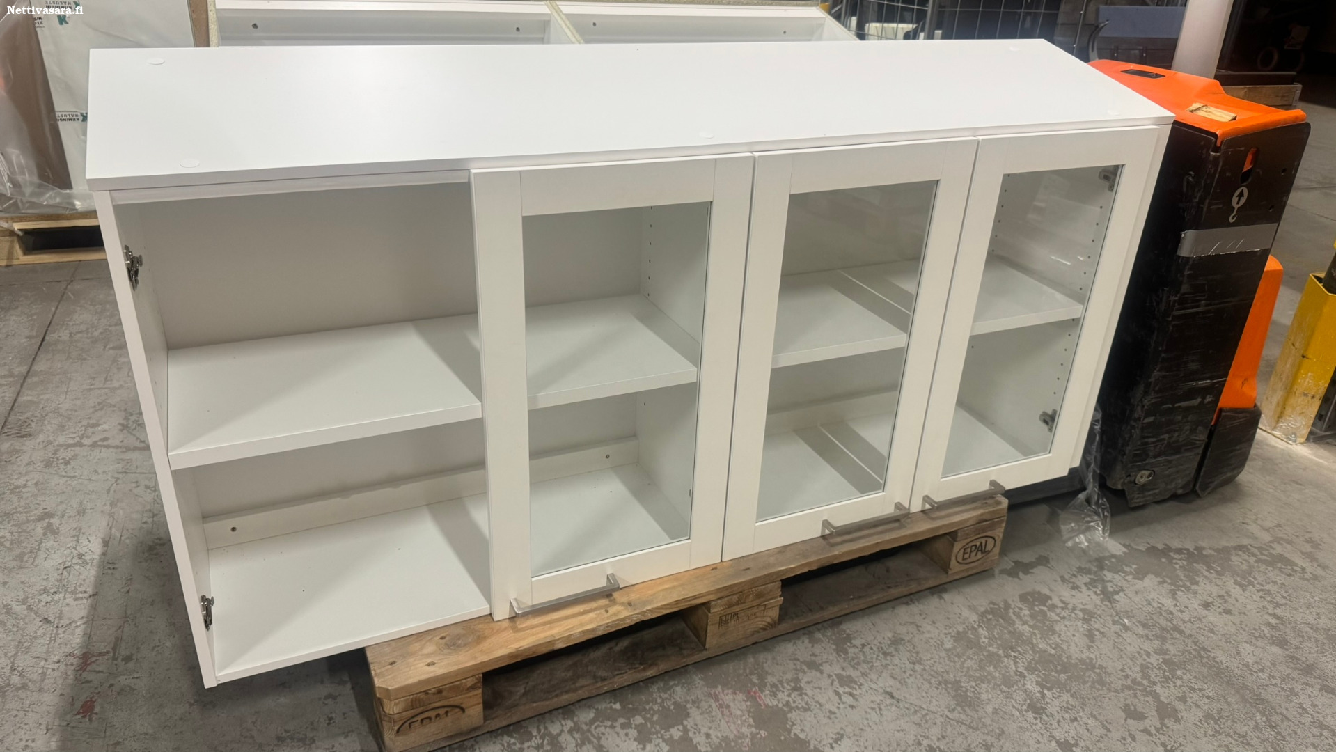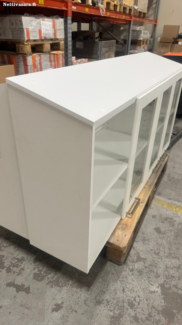 Tuote 1 on kolme lasiruudullista ovea. Yksi ovi uupuu. Sisällä kaksi hyllylevyä. Tuote on kertaalleen paikalleen asennettu ja irroittettu tämän jälkeen.