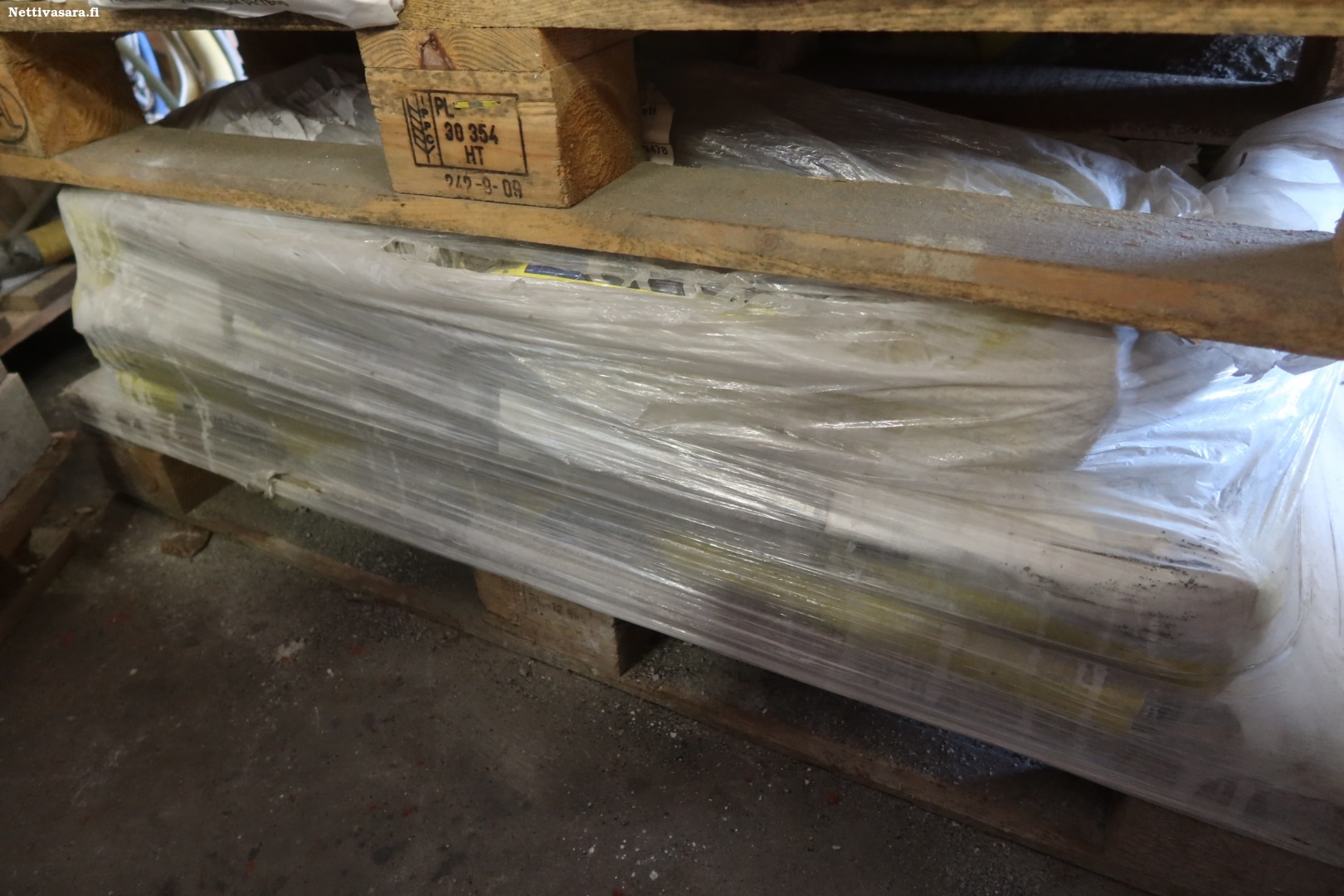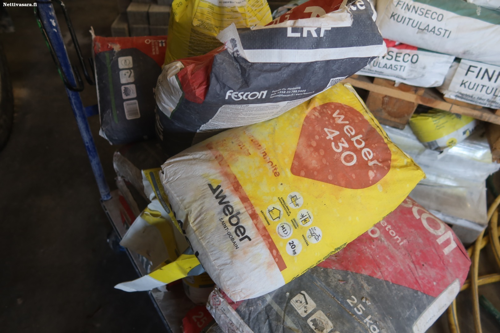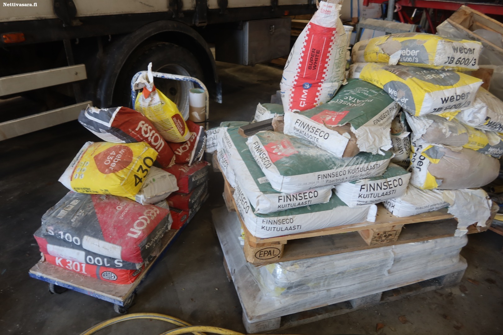 Erilaisia laasteja ja tasotteita kahdella kuormalavalla ja tavarakärryssä sisältäen mm.