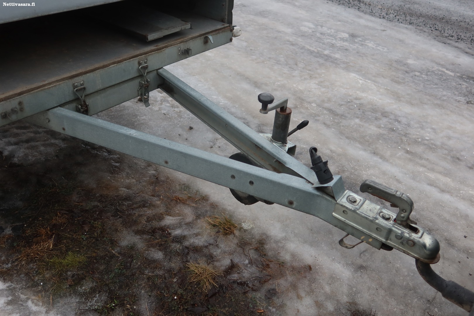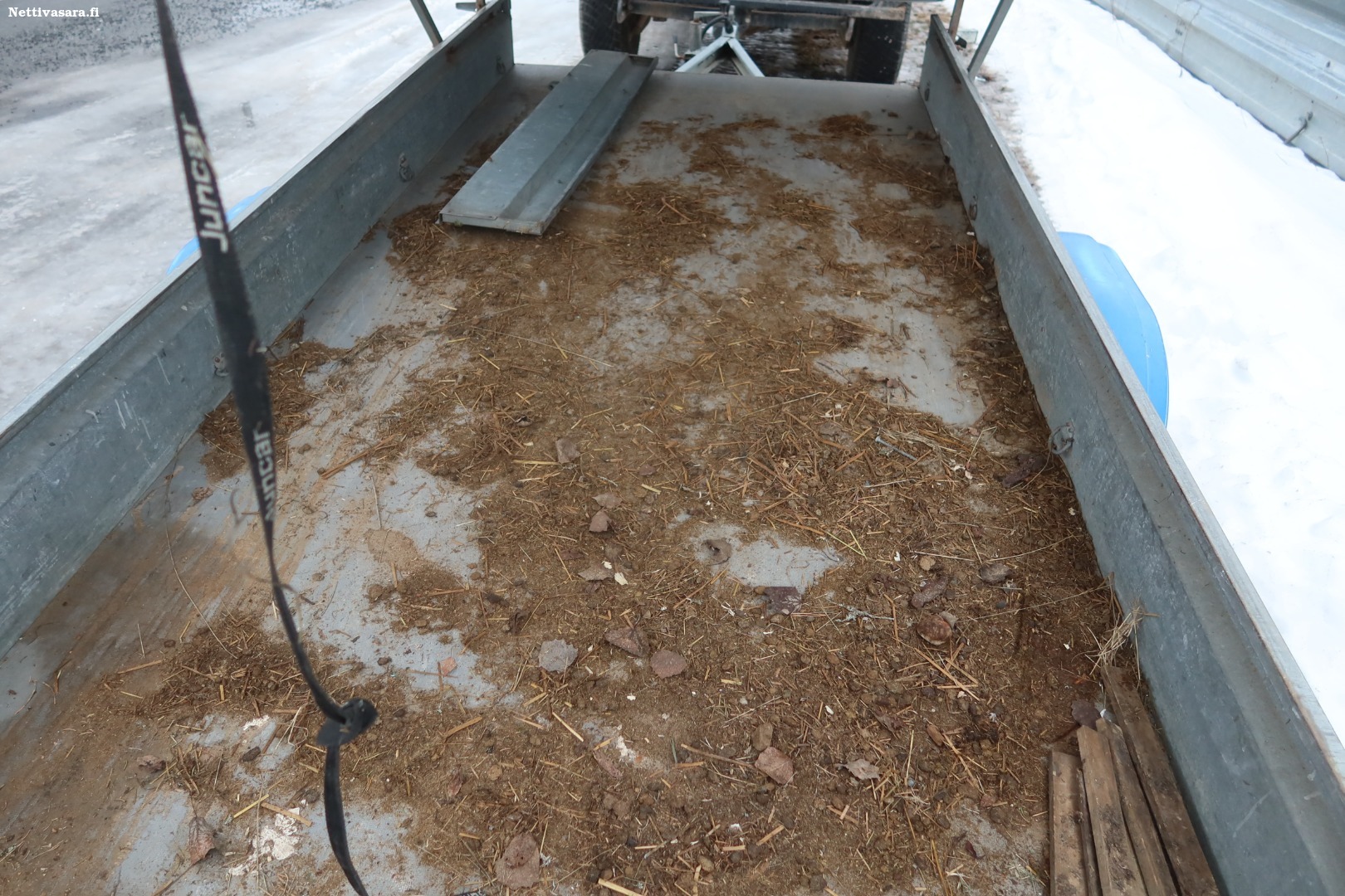 Etulaita irrotettuna perävaunun sisällä. Saranatapit puuttuvat