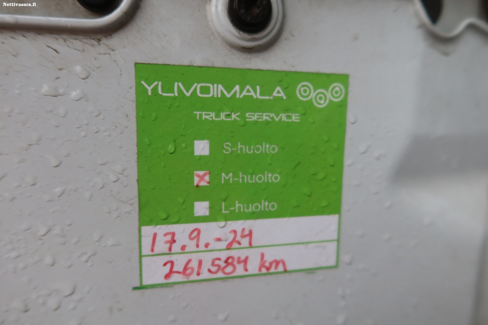 Viimeinen huolto tehty 17.9.2024, 261584km. Tämän jälkeen tehty yksi öljynvaihto
