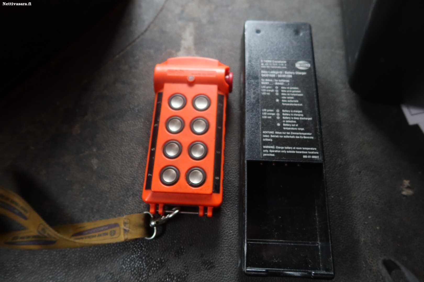 Koukkulaitteeseen langaton kaukosäädin (kytketty pois käytöstä), vara-akku ja latauslaite .