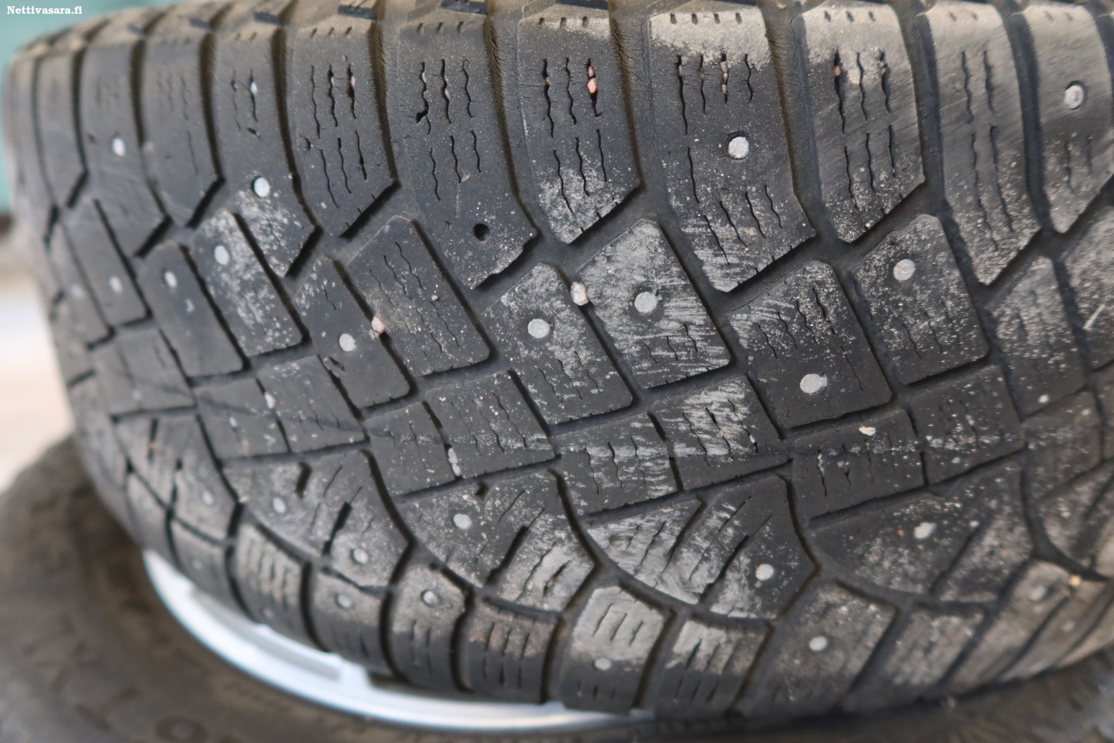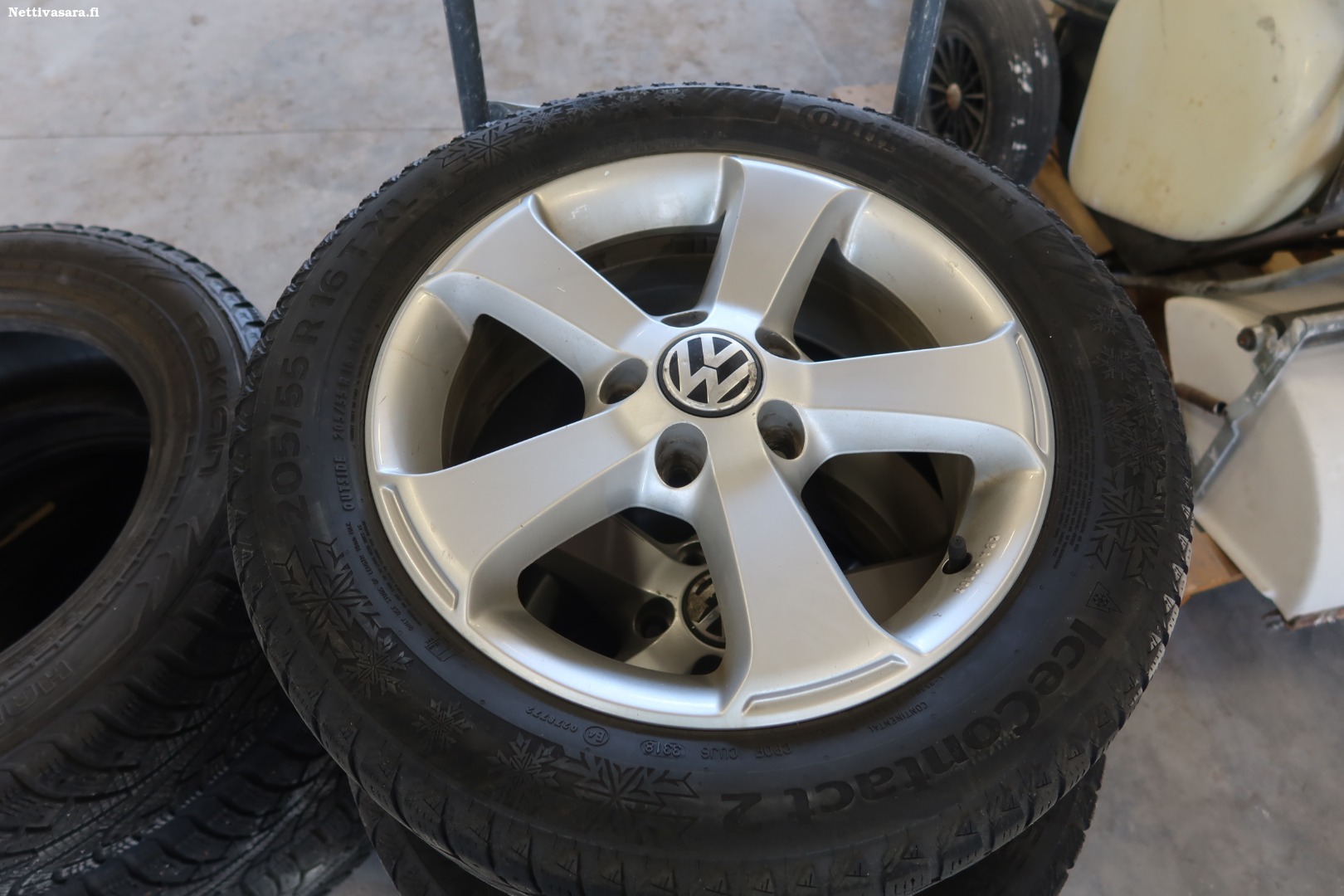 VW rengassarja alumiinivanteilla, huonokuntoset nastarenkaat 205/55 R16