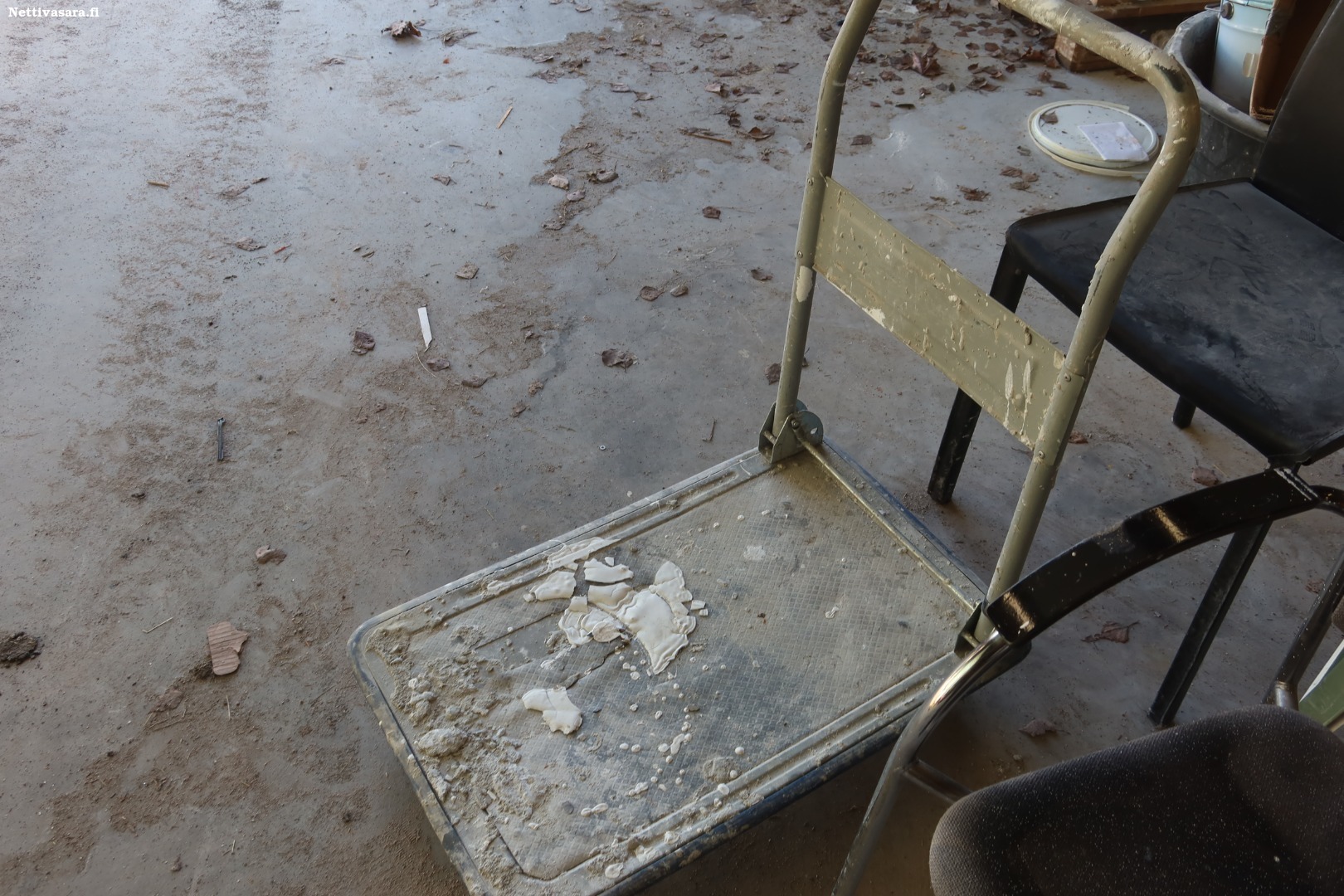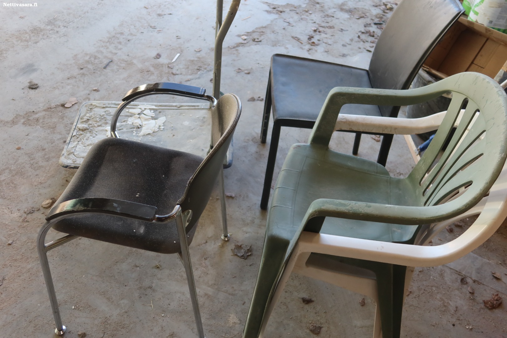 Rakennusmuovia, tuoleja, kuljetuskärry