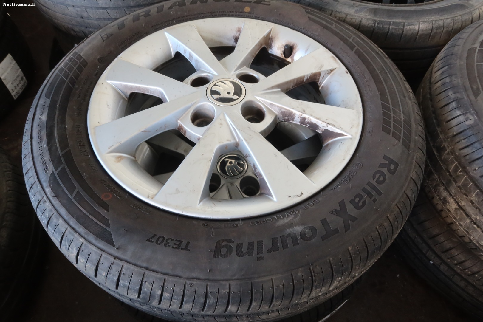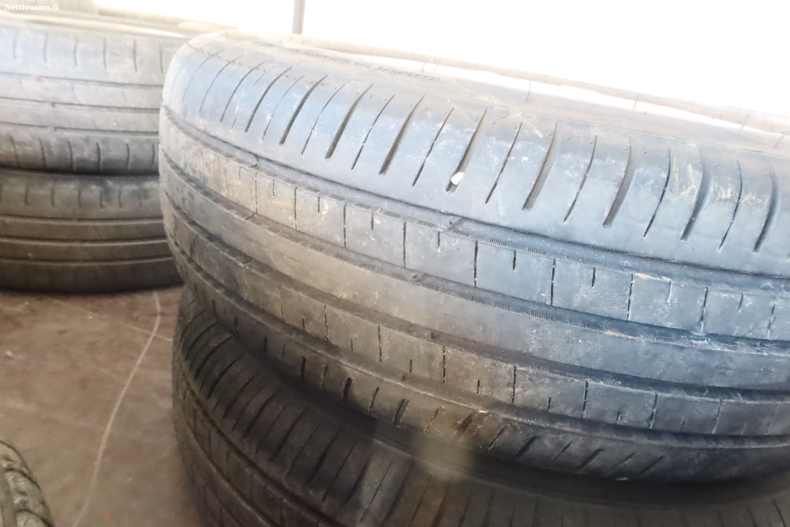 Kahdet renkaat, alla talvirenkaat peltivanteilla, kesärenkaat aluvantiella